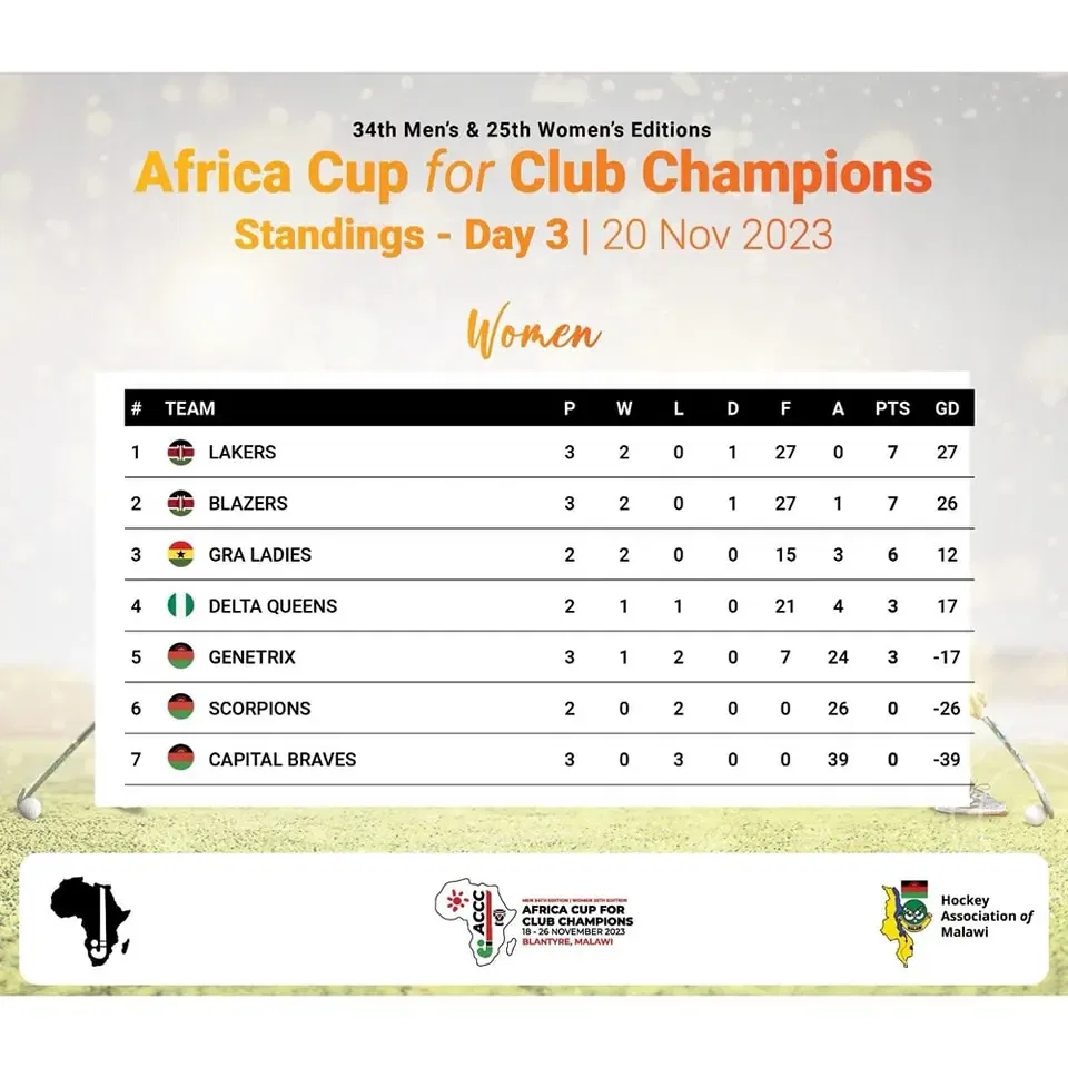 POOL STANDINGS after Day 3: Africa Cup for Club Champions [ACCC] 34th Men & 25th Women Editions | Blantyre – Malawi  18-26 November 2023.
