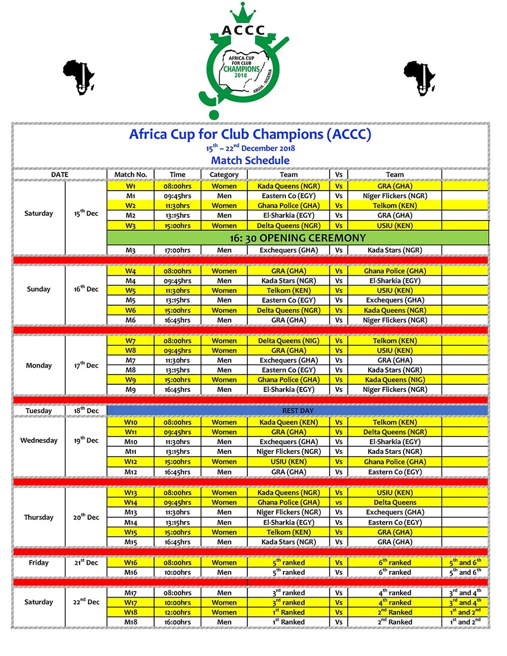 ACCC 2018: Ruthless GRA edge closer to another final ACCC 2021 (MEN 32nd Edition – WOMEN 23rd Edition) – Match Schedule – Day 1 ACCC 2021 (MEN 32nd Edition – WOMEN 23rd Edition) – 5th & 6th Match Classification – Day 6 ACCC [33 M – 24 W] DAY 3 MATCH RESULTS: 15 FEBRUARY 2023