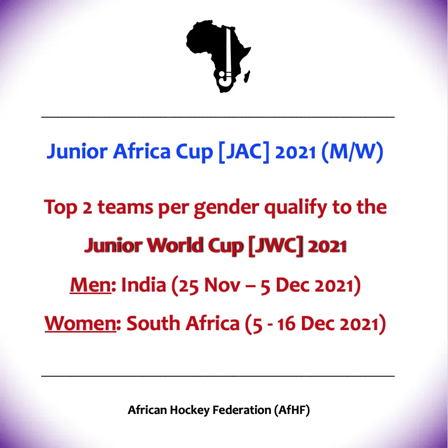 Qualification pathway: Top 2 teams per gender qualify to the Junior World Cup [JWC] 2021 (Men: India 25 Nov – 5 Dec 2021) (Women: South Africa 5 – 16 Dec 2021)