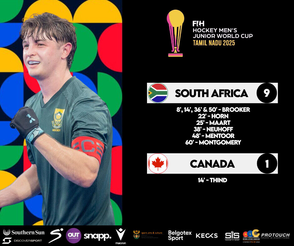 South Africa produced a statement performance in their final Pool A match, beating Canada 9–1 in Tamil Nadu to record their biggest Junior World Cup victory since a 9–0 triumph over Mexico back in 2005. The result gives the African champions a faint but very real chance of finishing as one of the two best second-placed teams, the final pathway into the quarter-finals.