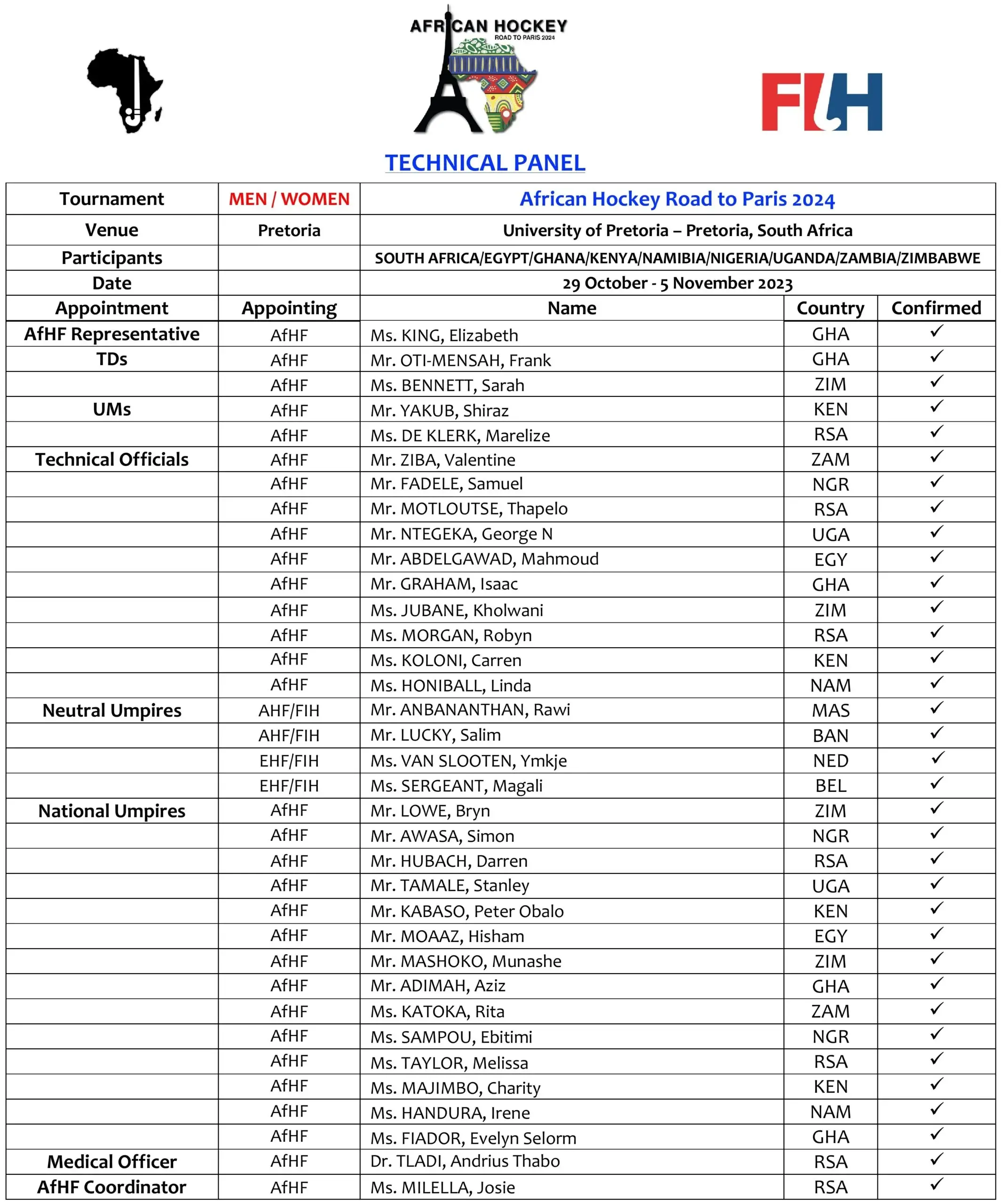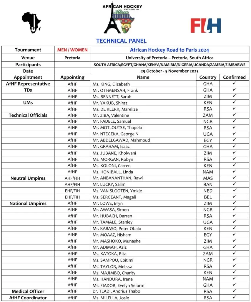 Technical Panel for the “African Hockey Road To Paris 2024 (M/W)” | Pretoria, South Africa (29th Oct – 5th Nov 2023)
